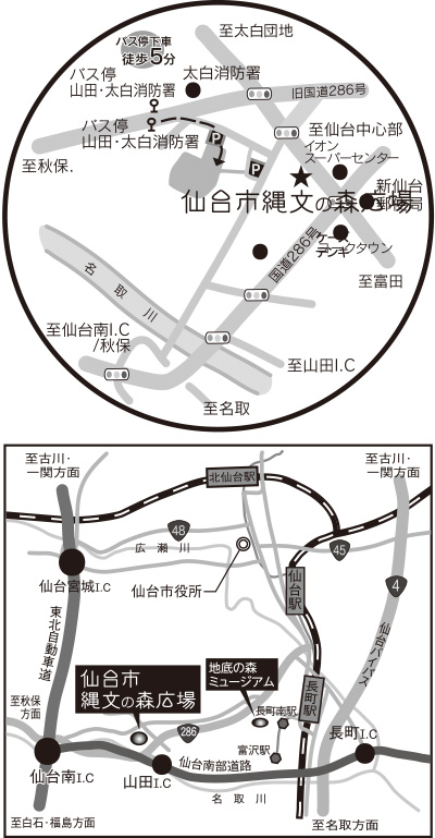 バスでご来館の場合・・・宮城交通バス「山田・太白消防前」停留所下車 徒歩5分、「南ニュータウン」「日本平」「秋保」「茂庭台」行き
